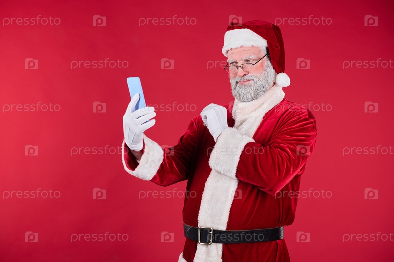Улыбающийся Санта Клаус делает селфи на красном фоне