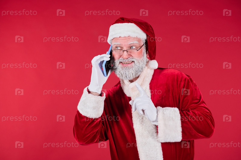 Улыбающийся Санта-Клаус разговаривает со смартфоном в красном костюме