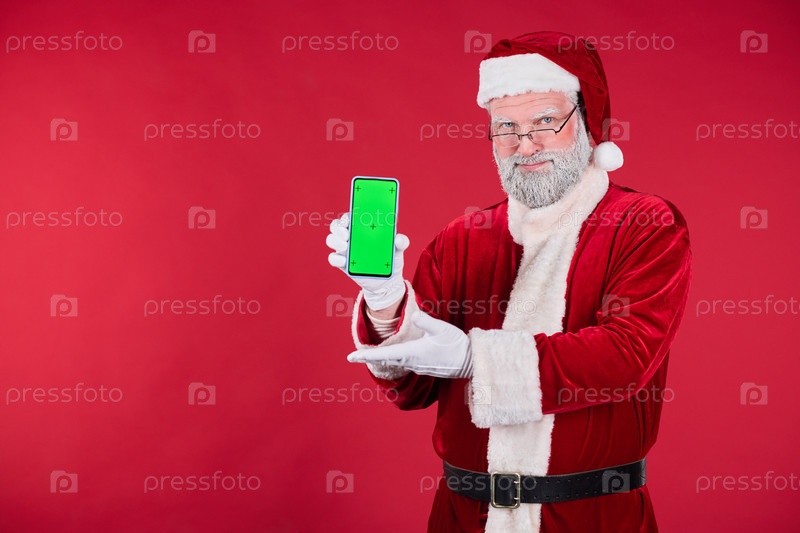 Портрет Санты-Клауса, держащего смартфон на красном фоне