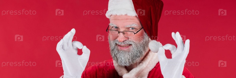 Портрет улыбающегося Санта-Клауса в очках и красном костюме
