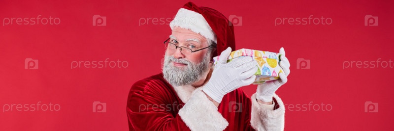Портрет Санты-Клауса, держащего подарок на красном фоне