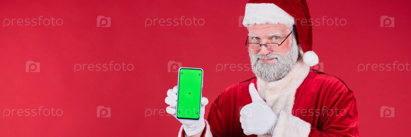 Улыбающийся Санта Клаус держит смартфон с зеленым экраном