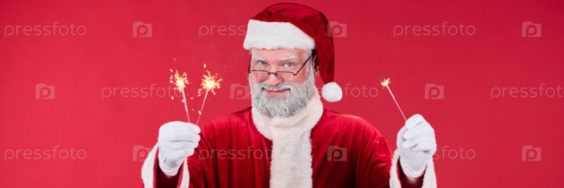 Держащий искри Санта-Клауса с красным фоном