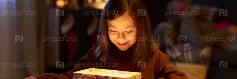 Молодая девушка улыбается, открывая коробку с подарками на Рождество