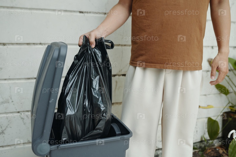 Удаление мусорного мешка лицом, носящим коричневую рубашку