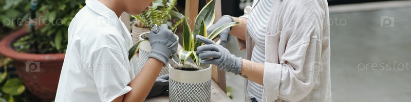Люди, заботящиеся о комнатных растениях вместе в наружной обстановке