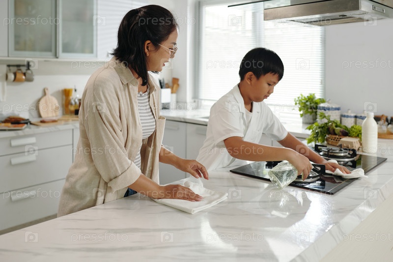 Уборка столешниц в современной кухне вместе