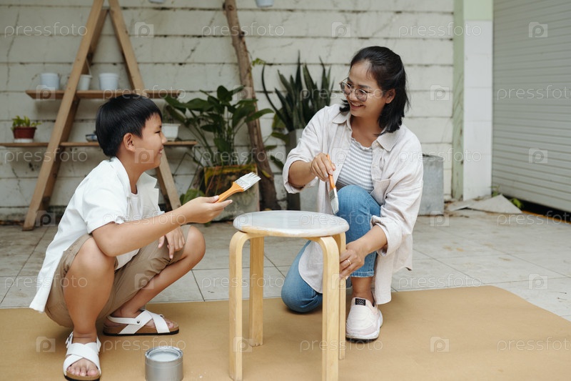 Мать и сын занимаются краской мебели на открытом воздухе