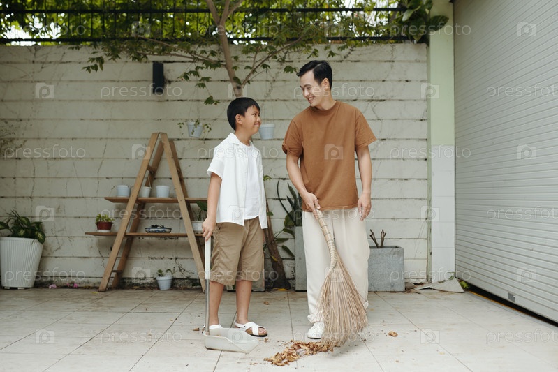 Отец и сын убирают территорию двора вместе, улыбаясь