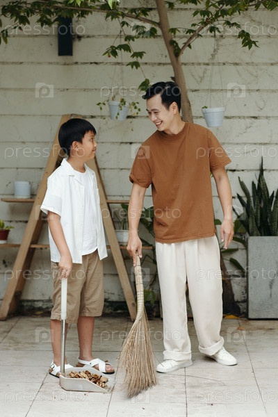 Отец и сын вместе подметают листья в саду