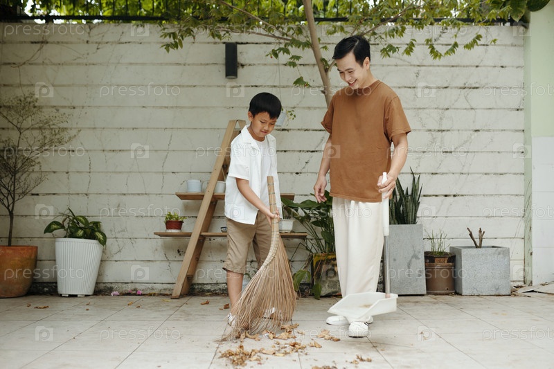 Отец и сын вместе убирают задний двор снаружи