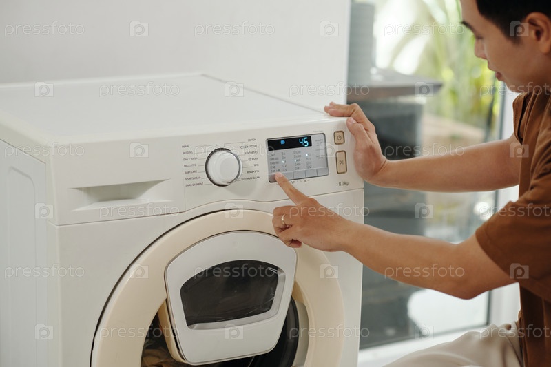 Показывая на панель управления стиральной машиной в яркой комнате