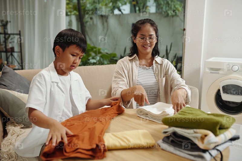 Складка и сортировка одежды с семьей в гостиной