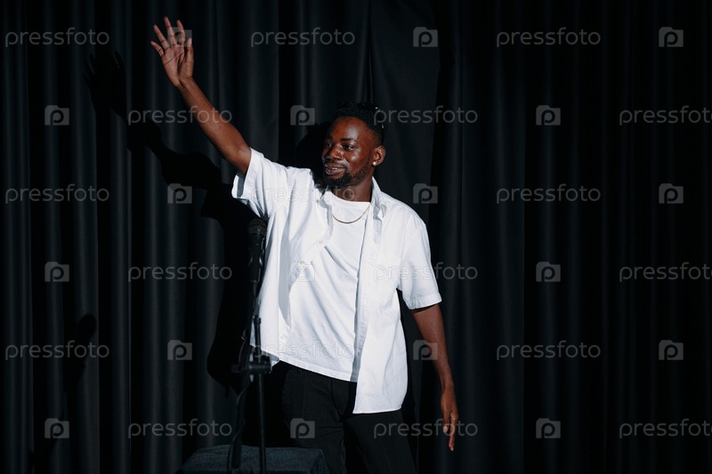 Мужчина, размахивающий рукой на сцене, выступает с микрофоном