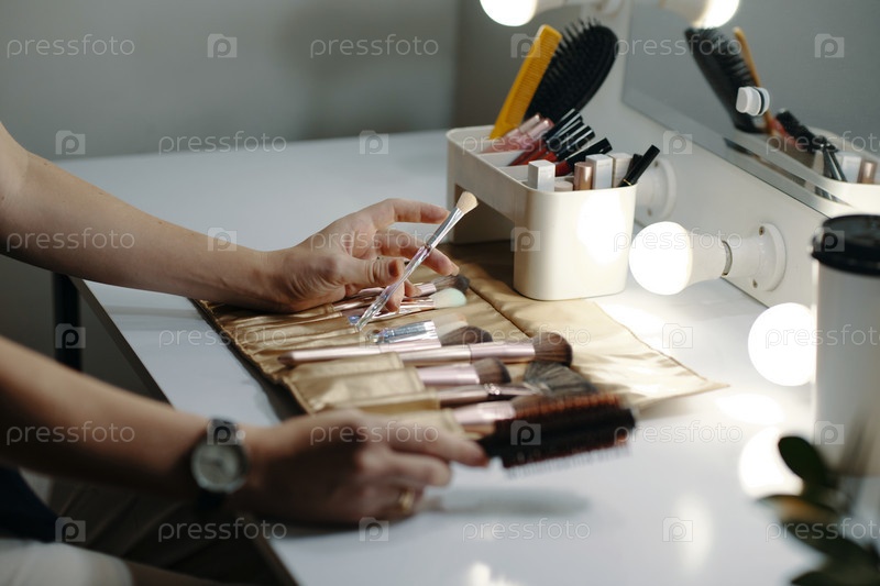 Подготовка макияжа на столе для суеты с помощью освещенного зеркала