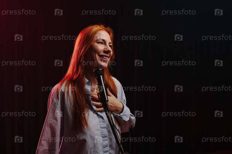 Улыбающаяся женщина держит микрофон на темном фоне