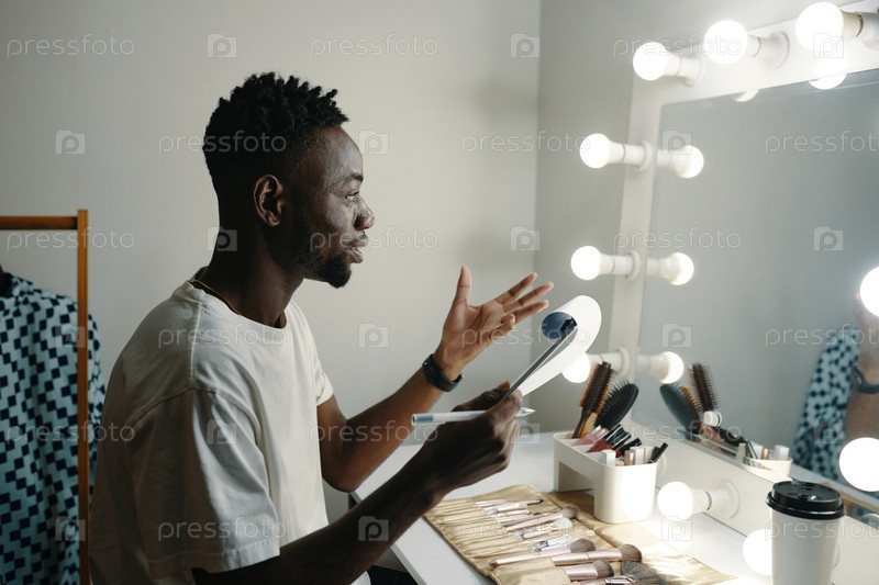 Держит щетку для макияжа перед зеркалом тщеславия