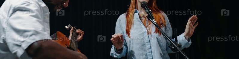 Выполнение дуэта с акустической гитарой и вокалистом на сцене