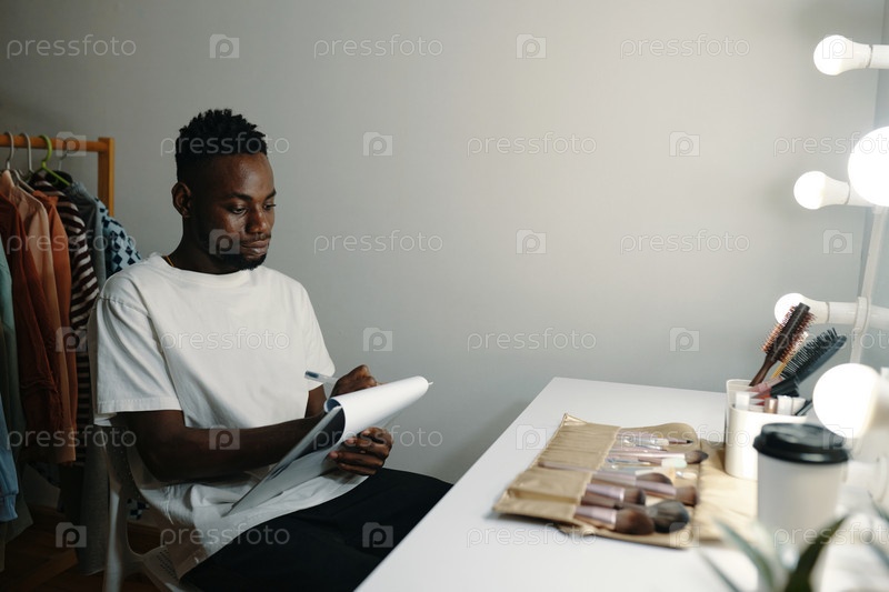 Человек, читающий в раздевалке с освещенным зеркалом