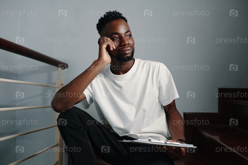 Африканский американец сидит вдумчиво, держа планшет