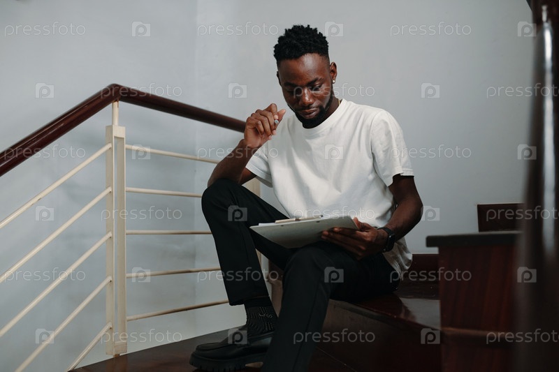 Мужчина просматривает документы, сидя на лестнице