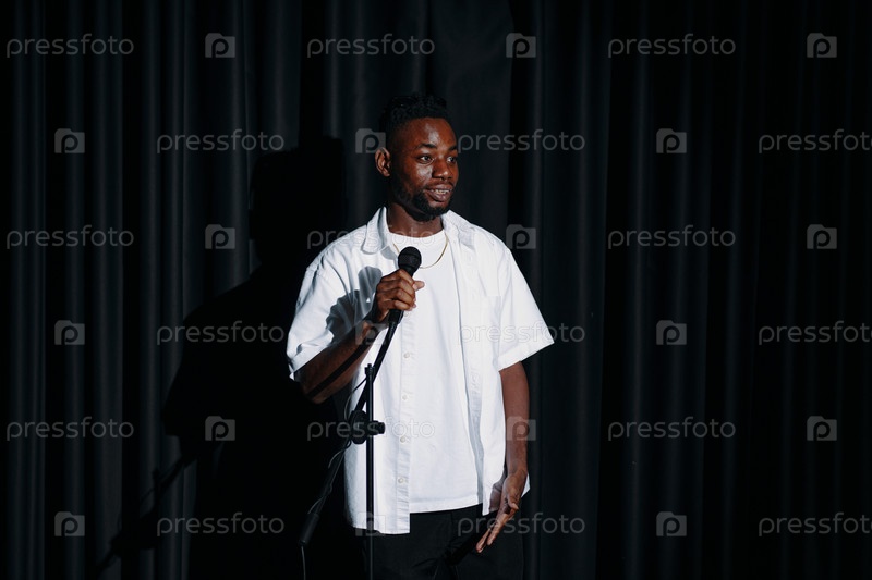 Стоящий комик, держащий микрофон на сцене в центре внимания