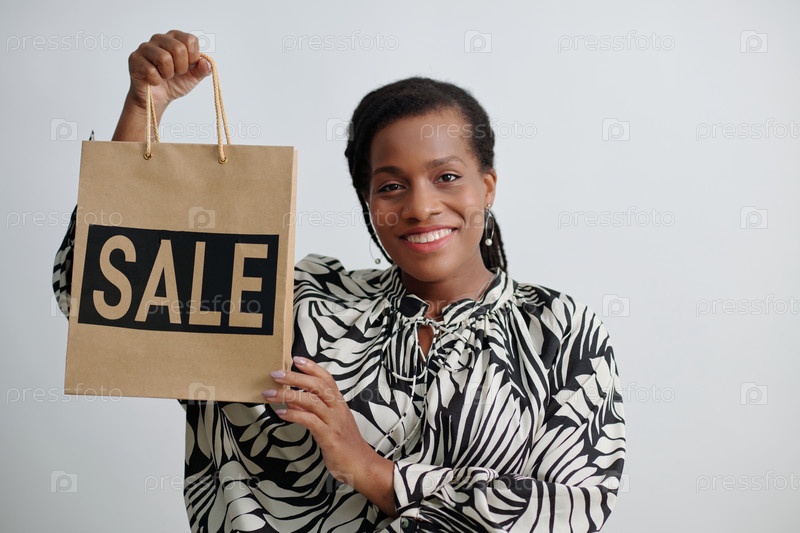 Улыбающаяся женщина держит сумку для покупок с табличкой продажи