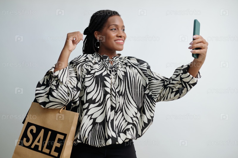 Улыбающаяся женщина делает селфи, держа в руках сумку с покупками