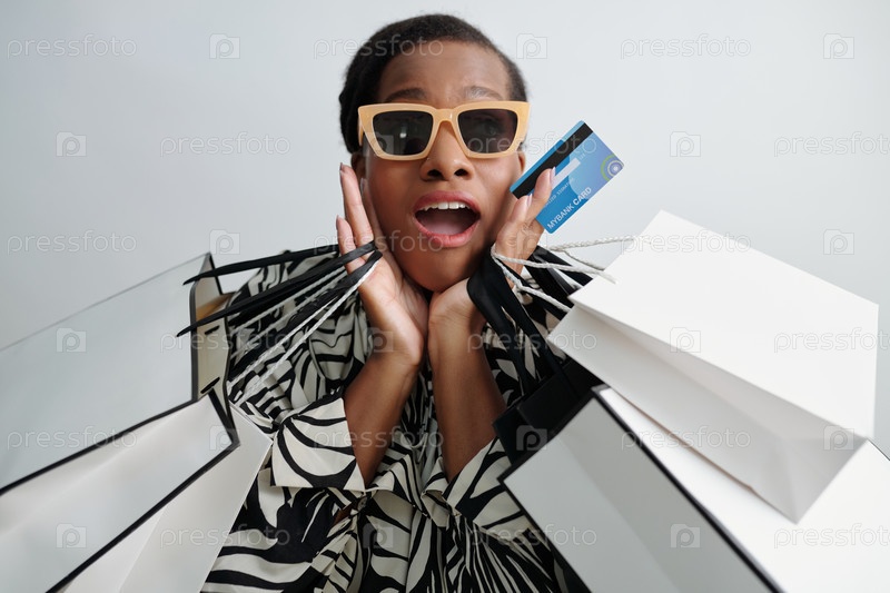 Портрет взволнованной женщины, держащей сумки для покупок и кредитную карту