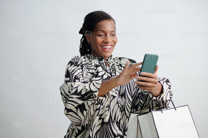 Улыбающаяся афроамериканская женщина использует смартфон во время покупок