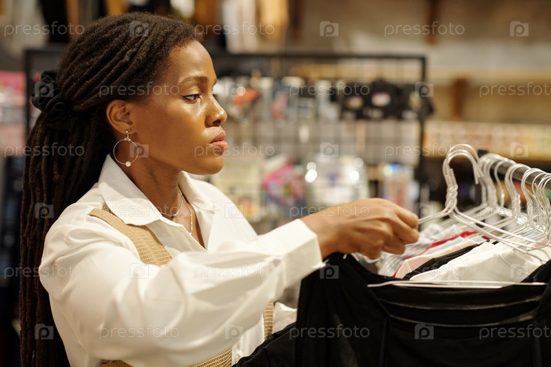 Женщина просматривает стойку для одежды в розничном магазине