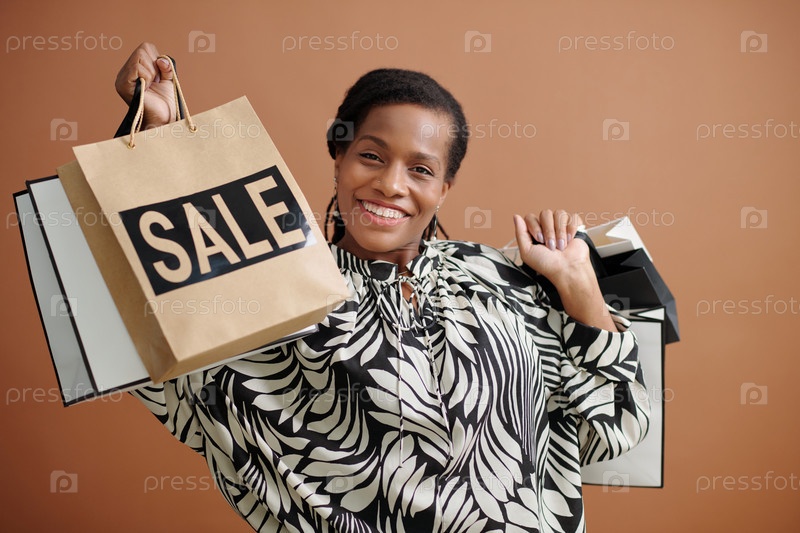 Улыбающаяся женщина держит сумки для покупок со знаком продажи