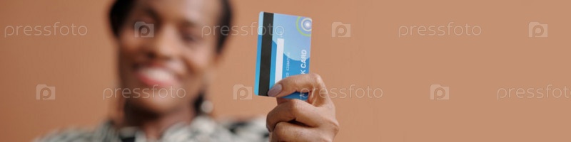 Улыбающаяся женщина держит кредитную карту на коричневом фоне
