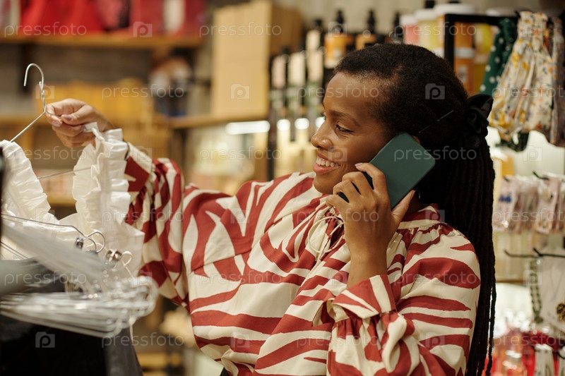 Женщина выбирает одежду, разговаривая со смартфоном