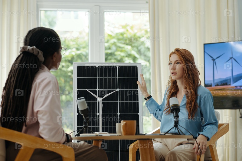 Женщина рассказывает журналисту о солнечной панели