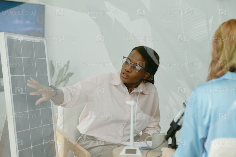 Женщина объясняет работу солнечной панели журналисту