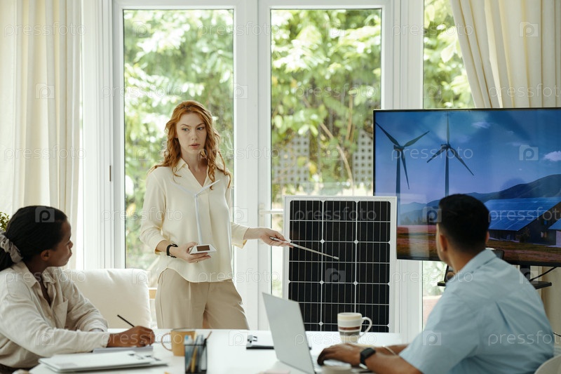 Женщина дает презентацию солнечной батареи коллегам
