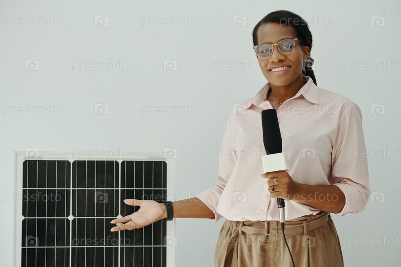 Женщина, рассказывающая о солнечной панели на конференции