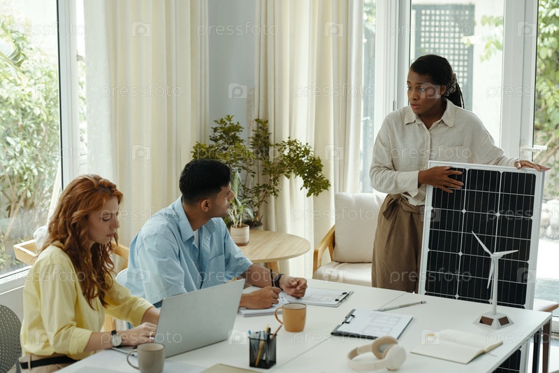 Женщина, представляющая солнечную батарею коллегам