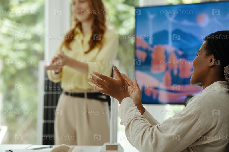 Женщина, аплодирующая коллеге на презентации