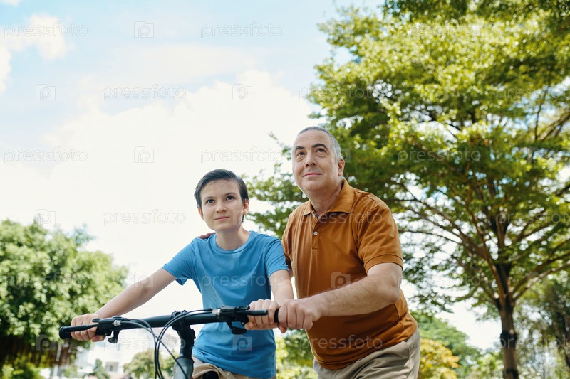 Дедушка учит сына ездить на велосипеде