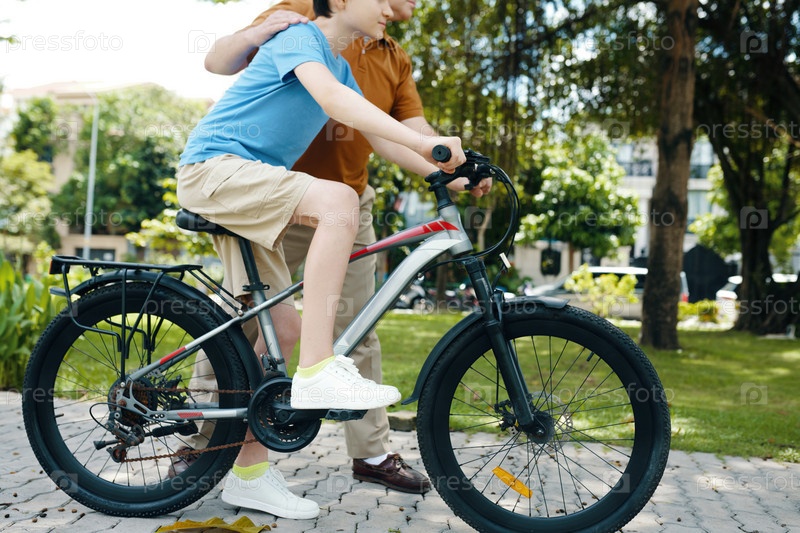 Маленький мальчик едет на велосипеде с дедушкой