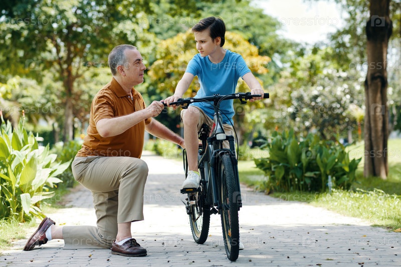 Маленький мальчик едет на велосипеде со своим дедушкой
