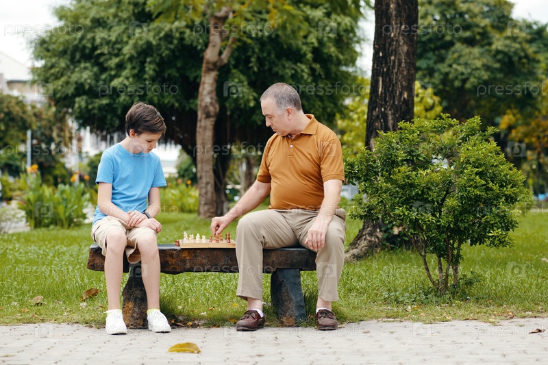 Внук играет в шахматы со своим дедушкой