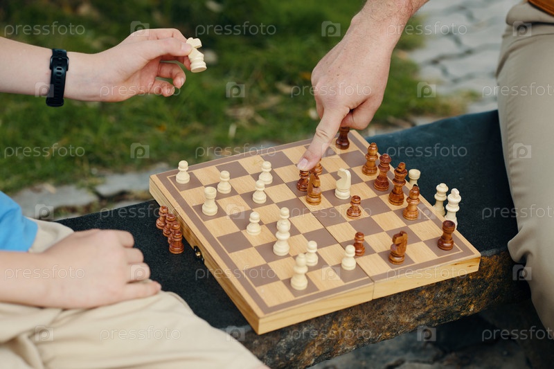Семья играет в шахматы вместе на свежем воздухе