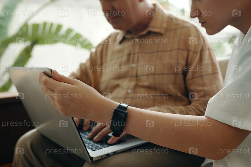 Внук учит своего дедушку пользоваться ноутбуком