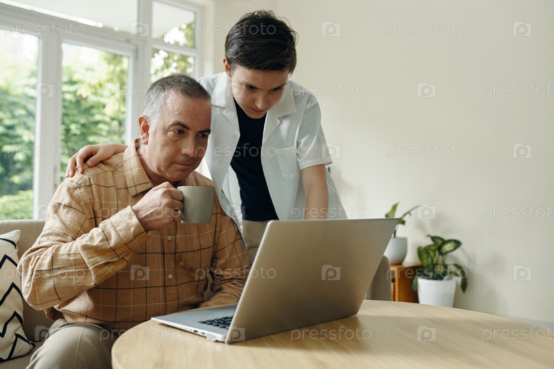 Старший мужчина учится пользоваться ноутбуком