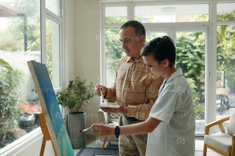 Мальчик рисует со своим дедушкой