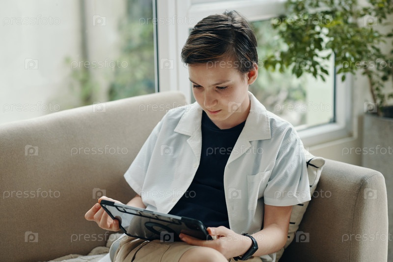 Мальчик, использующий цифровой планшет дома