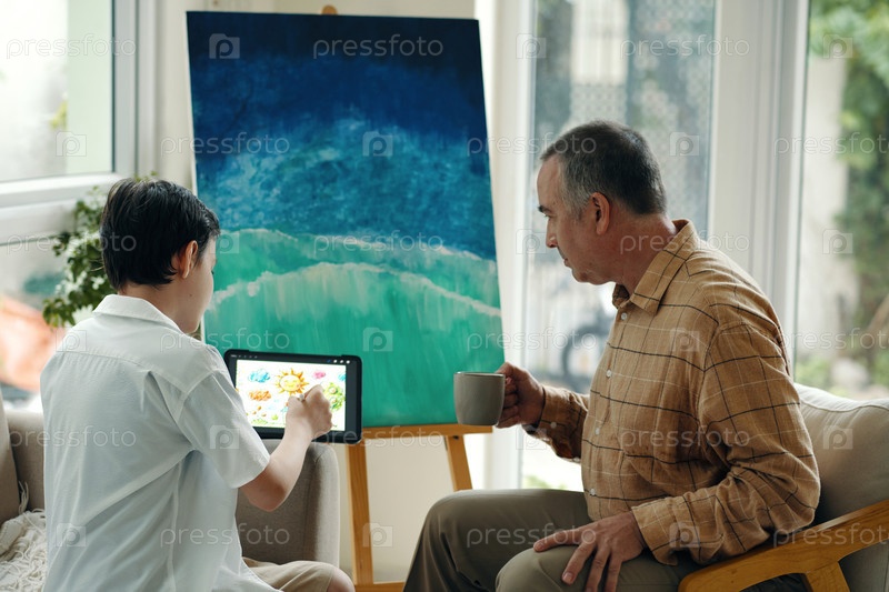 Мальчик учит своего дедушку рисовать